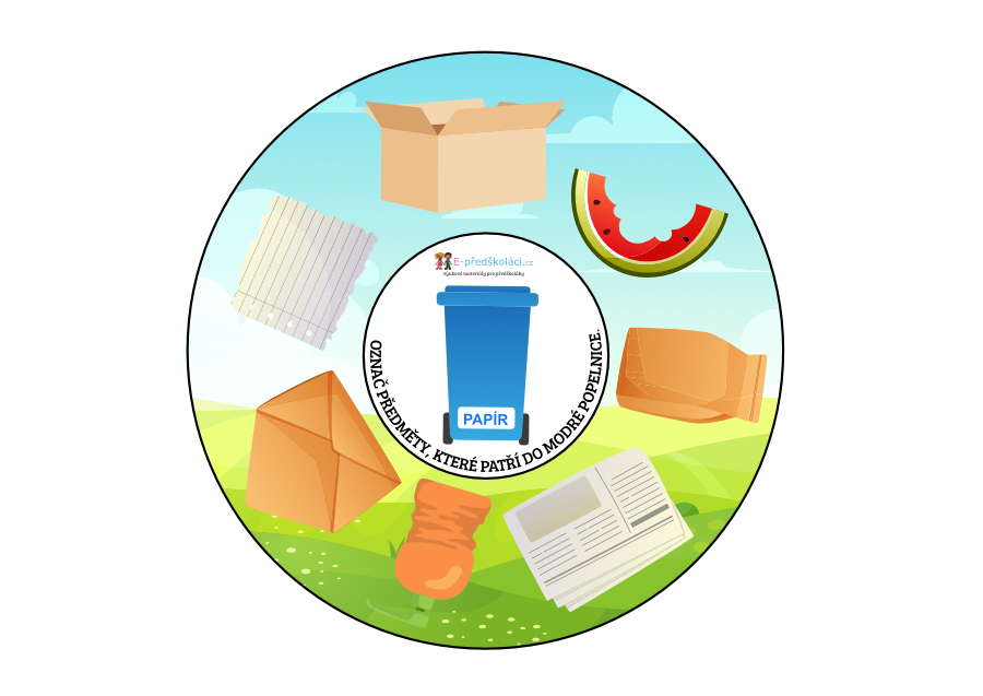 V materiálu naleznete 13 stran s 9 kruhy. Uprostřed kruhu se nachází příslušná popelnice, děti označí předměty, které patří do dané popelnice.